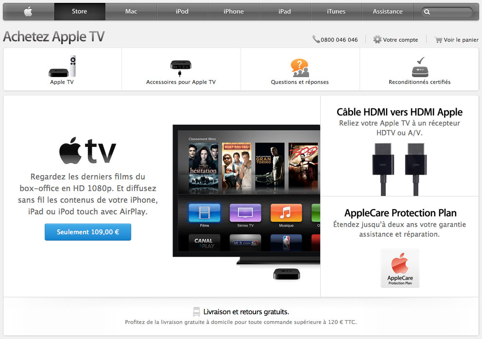 À l’instar des iPhone, iPad, iPod et Mac, l’Apple TV se voit dotée de ses propres sections « Questions et réponses », « Accessoires pour Apple TV », « Reconditionnés certifiés ». Auparavant, l’Apple TV aurait pu elle même passer pour un accessoire lors de la navigation sur le store, et maintenant elle a son propre « Apple care protection plan »…