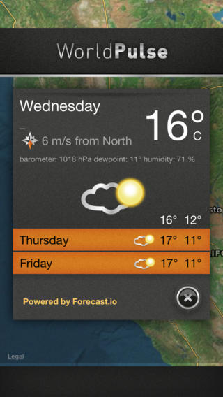 Faites tourner le globe, zoomez et dé-zoomez, tapez à un endroit pour voir une carte et bien sur la météo en temps réel. Télécharger gratuitement WorldPulse Pro.