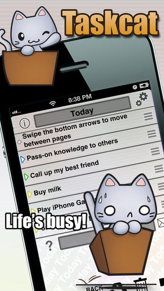 Taskcat est un gestionnaire de taches rapide et gestuel avec aucun menu ou sous-menu pour naviguer. Ajoutez, poursuivez votre journée, effacez et choisissez un nouvel objectif. Télécharger gratuitement Taskcat.
