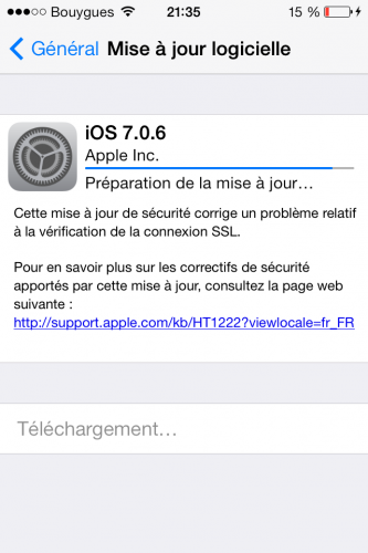 Cette mise à jour d’iOS 7.0.6 et d’iOS 6.1.6 (et 6.0.2 pour l’Apple TV) permet, selon Apple, de corriger un problème relatif à la vérification de la connexion SSL et est disponible pour tous les appareils dès maintenant. Pour effectuer la mise à jour, rendez-vous dans Réglages>>Général>>Mise à jour logicielle.