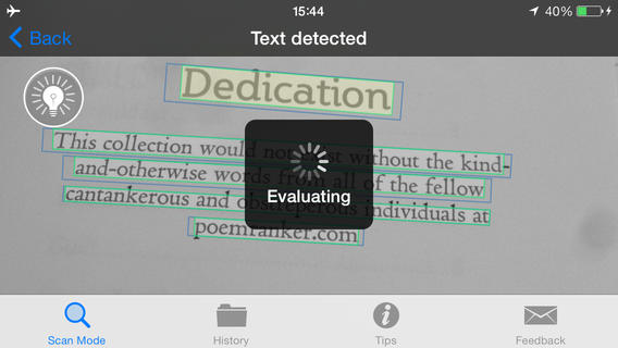 Cette application est capable de scanner une page de texte et de la retranscrire. Il faut tout de même bien relire le résultat qui peut parfois différer grandement du texte scanné. Télécharger gratuitement TextDetective.