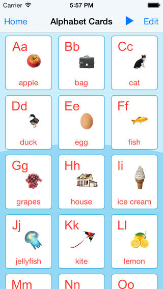 Cette app comprend tout un ensemble de cartes colorées et sonorisées ainsi que trois exercices de mémorisation des lettres. En outre, vous pouvez personnaliser complètement toute carte, modifier l’inscription et enregistrer votre propre voix. Pour ce faire, cliquez d’abord le bouton « Modifier » sur l’écran de la liste des cartes, puis cliquez le bouton bleu « Éditer » qui apparaîtra dans le coin supérieur droit de chaque carte. Télécharger gratuitement Cartes de l’alphabet anglais et quiz.