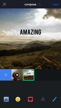 Malgré ce point négatif, elle est assez intuitive dans son utilisation pour parvenir à s’en dépatouiller facilement. Afin de se lancer dans la création, il suffira d’une simple pression sur l’icône + dans le coin supérieur droit. Cela vous donne ainsi accès aux différents outils qu’il est possible d’utiliser. Ils sont au nombre de 5, et permettent chacun d’ajouter leur pierre à l’édifice de votre imagination. Vous pourrez dans un premier temps sélectionner les photos et les gifs que vous souhaitez inclure à votre vidéo-diaporama. Vous aurez le choix parmi une sélection dans l’appli, ou au sein de votre photothèque.