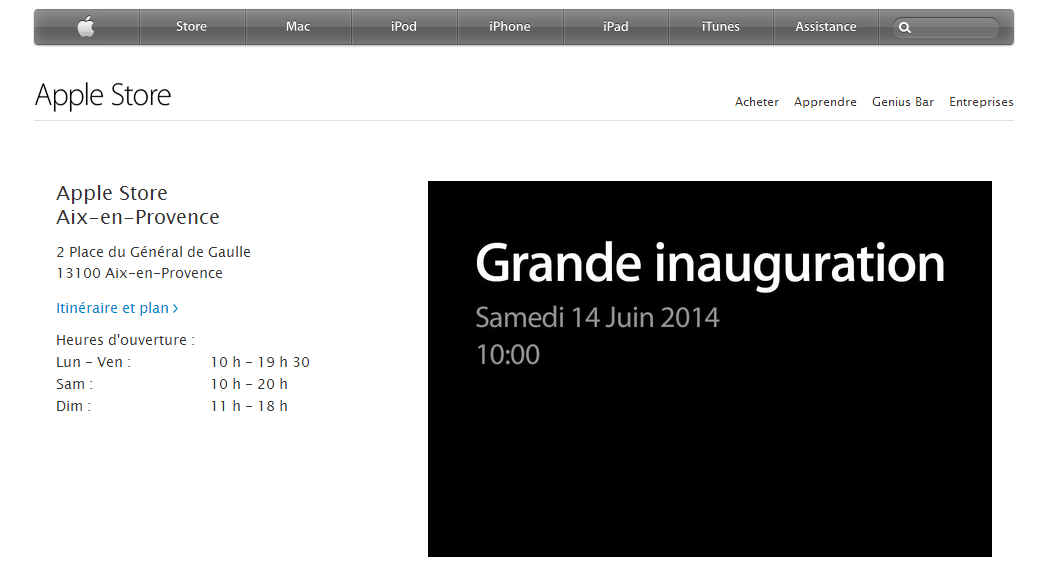 Cet Apple Store, en plus d’avoir le prestige d’être une propriété de Cupertino a l’avantage d’être ouvert toute la semaine, c’est-à-dire 7 jours sur 7, et se situera à l’adresse suivante : 2 Place du Général de Gaulle, 13100 Aix-en-Provence. Il est intéressant de rappeler qu’Apple profitera des jours qui suivent l’inauguration pour organiser divers ateliers, afin de « booster » ses ventes, et de rentabiliser au maximum cet investissement, avant de commencer à en tirer profit.