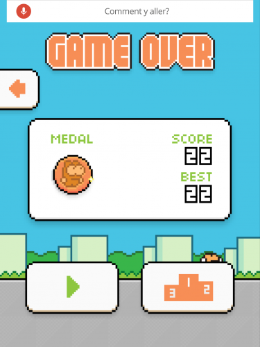 Premier changement lors du démarrage du jeu, l’espace entre le sol et le premier obstacle a été agrandi, ce qui fait qu’on à plus le temps d’appréhender le gameplay qui lui a été ralenti, devenant nettement plus jouable. Pour preuve, mon meilleur score avant la mise à jour était de 2 (après environ un quart d’heure de rage jeu), ce matin avec seulement un essai j’ai réussi à monter jusqu’à 22 ! Donc pour ceux qui avaient supprimé le jeu à cause de sa difficulté, voilà qui devrait vous faire revenir sur vos pas…