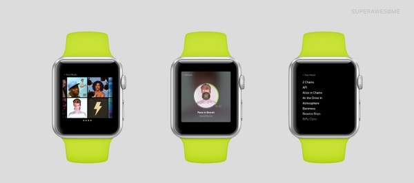 Parmi les éléments qui reviennent le plus dans les représentations d’applis, les formes rondes ont la cote. Les démonstrations qui avaient été faites lors de la présentation de la future Apple Watch ont montré ce nuage d’applications qui serait visible sur l’écran. Dans le cas d’applis de streaming musical – comme Beats Music ou Spotify – l’usage du bouton poussoir pour sélectionner sa piste et la lancer paraît plausible. Reste à savoir si les titres des chansons ou les jacquettes des albums ne termineront pas en timbre-poste illisible.