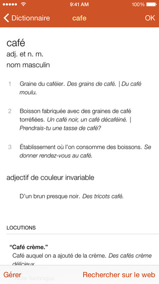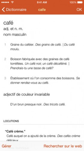 Cette app fait appel aux définitions intégrées à l’iOS. D’autres dictionnaires téléchargeables gratuitement sont disponibles pour l’anglais, le français, l’espagnol, l’italien, l’allemand, le néerlandais ainsi que d’autres langues. Télécharger gratuitement Dictionnaire Compact.