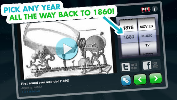 Choisissez une année et une catégorie parmi la télévision, le sport, les jeux vidéos, la musique et encore beaucoup d’autres, pour ensuite visualiser les vidéos des évènements qui ont marqué cette année-là. Noté 4,5/5 pour 355 avis. Télécharger gratuitement Video Time Machine.
