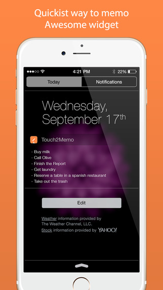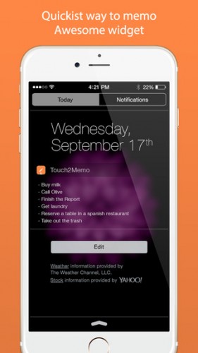Application qui nécessite iOS 8 et qui vous permettra d’insérer un widget de mémos dans l’onglet « Aujourd’hui » du centre de notifications. Rapide, simple et très pratique. Télécharger gratuitement Touch2Memo.