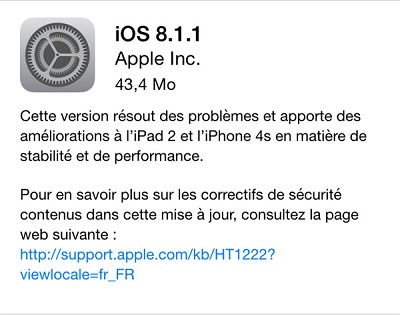 Alors que iOS 8 a eu un succès tout relatif et qu’il continue à progresser lentement dans les iDevices, la mise à jour iOS 8.1.1 peut-elle inciter les possesseurs d’iPhone 4S qui hésitent encore à franchir le pas ? En tout cas, le dernier update du système d’exploitation mobile à la Pomme est disponible depuis cette nuit. Il devrait permettre aux iPhone antérieurs à la 6ème génération de retrouver des performances correctes avec iOS 8. Sur le papier, les iPhone 4S doivent tourner sans difficultés sous le dernier système. Mais dans les faits, beaucoup d’utilisateurs se plaignent depuis plusieurs semaines de ralentissements, de crashs à répétition et d’une autonomie faiblarde.