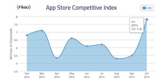 Apple vole de record en record. Cette fois, c’est l’App Store qui est à l’honneur. Selon la régie publicitaire Fiksu, les téléchargements d’applis sur le store de la Pomme ont atteint un niveau historique en octobre. En un mois, 7,8 millions de téléchargements ont été enregistrés sur les 200 applis gratuites les plus populaires de l’App Store. Un score qui doit beaucoup à la sortie des nouveaux iPhone et d’iOS 8.