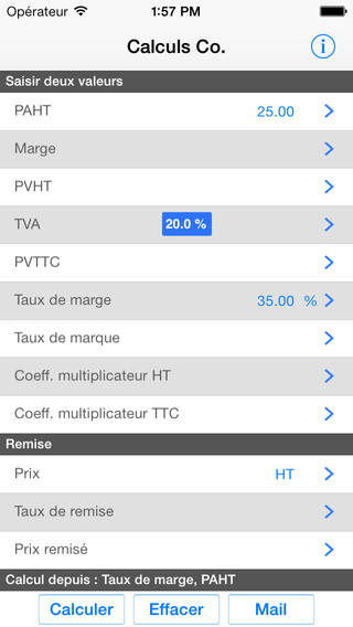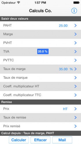 Application développée par un français qui permet de calculer toutes les valeurs se rapportant à un usage commercial, c’est à dire la TVa, le taux de marge, les remises. Noté 4/5 pour 29 avis. Télécharger gratuitement Calculs Co & TVA.
