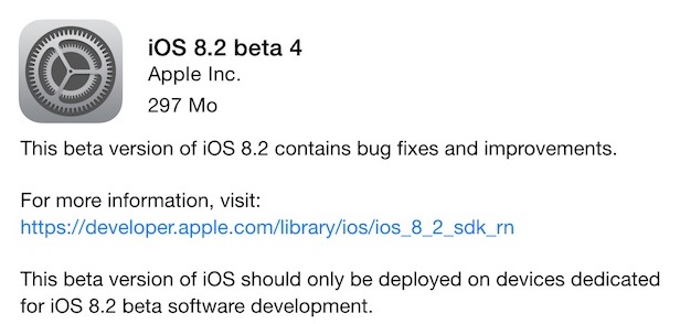 La quatrième (et dernière ?) version bêta de iOS 8.2 a été mise en ligne hier soir par Apple. Les développeurs sont donc invités à la décortiquer pour faire remonter les éventuels bugs. Cette mise à jour apporte le support tant attendu de l’Apple Watch sous la forme d’une interface proposant de détecter la future montre connectée. L’Apple Watch étant annoncée pour fin mars, on peut penser que la Pomme espère fournir un iOS 8.2 purgé de tous ses bugs pour cette date. En deux mois, plusieurs versions de test ont encore le temps d’être envoyée avant d’arriver à la version publique définitive.