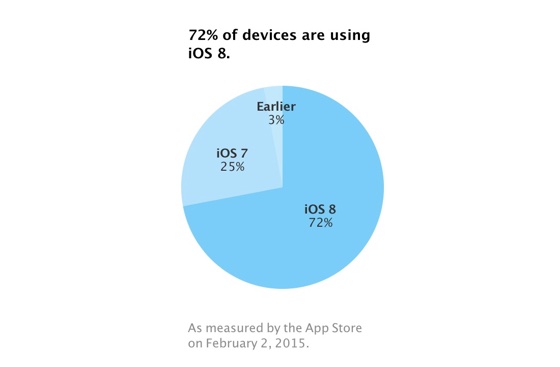 Enfin ! Le taux d’adoption de iOS 8 a atteint le seuil fatidique des 70% en ce début du mois de février. Selon le dernier sondage daté du 2 février, 72% des iDevices en circulation sont passés à la dernière génération du système d’exploitation mobile de la Pomme. Une évolution de 3 points par rapport au précédent décompte à mettre au crédit de la mise à jour 8.1.3 enfin libérée la semaine dernière.