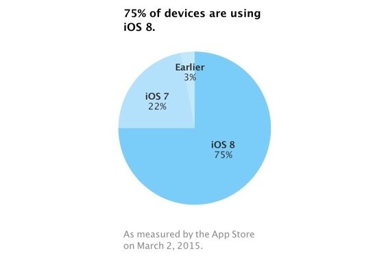 Dernier point d’étape avant mise à jour ! La dernière publication concernant le taux d’adoption de iOS 8 que Apple vient d’envoyer datée du 2 mars sera sans doute la dernière pour le système d’exploitation dans sa version actuelle. D’ici la semaine prochaine, iOS 8.2 devrait être une réalité. Le prochain sondage permettra donc de voir si de nouveaux utilisateurs ont franchi le pas de la mise à jour à cette occasion et si iOS 8 arrive à quitter le plancher de 75% qu’il a atteint au cours des deux dernières semaines.
