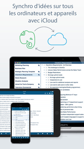 Cloud Outliner vous permet de créer et de partager des idées entre votre Mac, vos appareils iOS, et votre compte Evernote. Les processeurs d’idées vous donnent la possibilité d’organiser efficacement et naturellement vos plans, vos projets et vos idées d’une façon claire. Noté 3,5/5 pour 14 avis. Télécharger gratuitement Cloud Outliner.