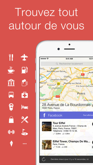 Découvrez et trouvez les personnes et les endroits qui vous entourent en utilisant des informations géolocalisées à partir des multiples moteurs de recherche locaux, des réseaux sociaux et des services de partage de fichiers multimédias. Compatible iPhone, iPod touch et iPad