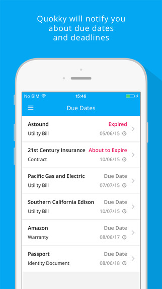 Quokky vous rappelle et vous notifie concernant les dates limites de paiement de factures, l’expiration de contrat à leur date anniversaire, de vos papiers d’identité, de garantie sur vos appareils ou de toute autre chose.