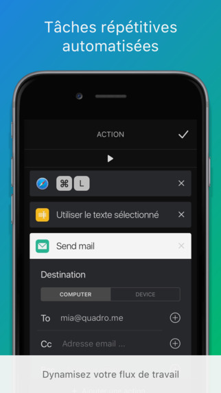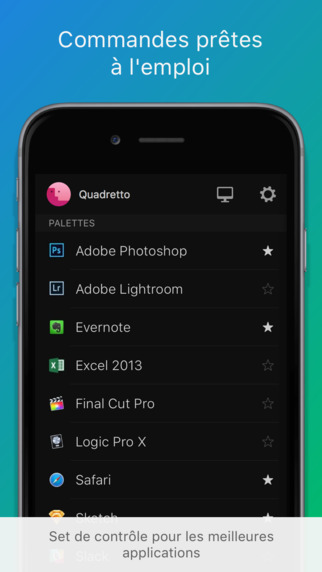 Quadro vous propose des commandes à réaliser directement depuis votre iPhone, des commandes préconfigurées pour les applications natives de Mac OS ou d’autres applications très populaires.
