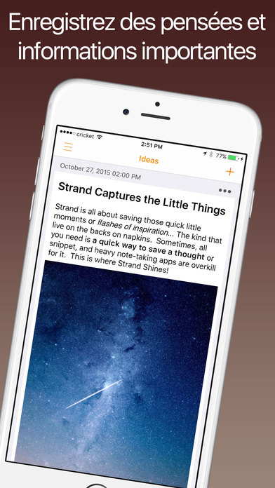 Enregistreur d’idées constitue une manière simple et amusante d’enregistrer des pensées et informations importantes. L’app est simple d’utilisation mais puissante. Vos notes sont instantanément enregistrées sur l’ensemble de vos appareils en temps réel, et sont même disponibles hors ligne. Nécessite iOS 9.1 ou une version ultérieure. Compatible avec l’iPhone, l’iPad et l’iPod touch.