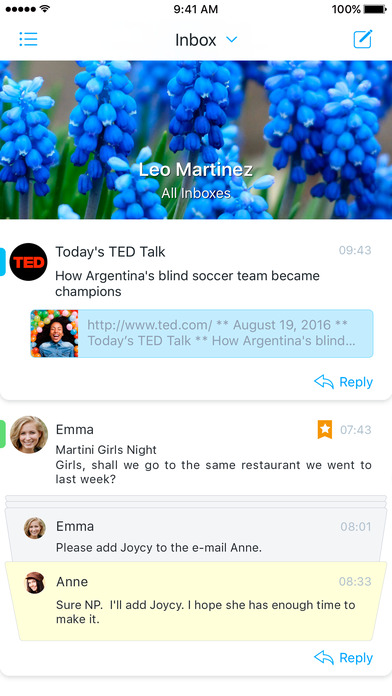Flow présente votre courrier comme un flux continu, vous permettant d’examiner et d’agir sur vos mails sans jamais perdre le nord. Nécessite iOS 8.0 ou une version ultérieure. Compatible avec l’iPhone, l’iPad et l’iPod touch.