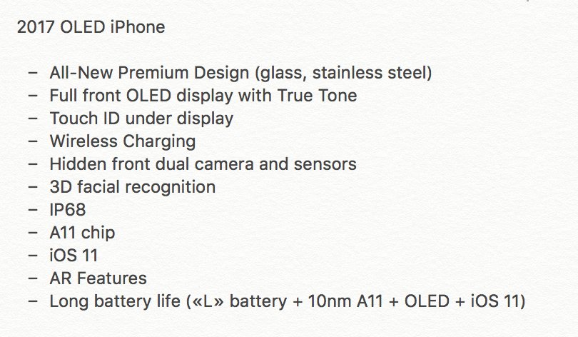 D’après la liste de Benjamin Geskin, l’iPhone 8 arborerait une toute nouvelle apparence, avec un design en verre et en acier ainsi qu’un écran OLED sans bordures avec True Tone. Le Touch ID serait pour sa part intégré non pas sur la tranche arrière de l’appareil mais bien sous la dalle, et la recharge sans fil serait aussi au programme. La caméra frontale et les capteurs (dont un capteur 3D) pourraient être quant à eux encastrés. Pour finir, le smartphone serait certifié IP68, doté d’un puce A11, tournera sous iOS 11 (il s’agit là d’une certitude), et apporterait également des fonctionnalités de réalité augmentée ainsi qu’une toute nouvelle batterie grandement optimisée.