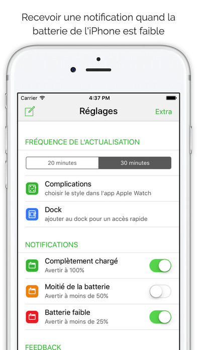 Recevez une notification sur votre Apple Watch lorsque la batterie de votre iPhone est faible. Nécessite iOS 10.0 ou une version ultérieure. Compatible avec l’iPhone, l’iPad et l’iPod touch. Sans achats in-app.