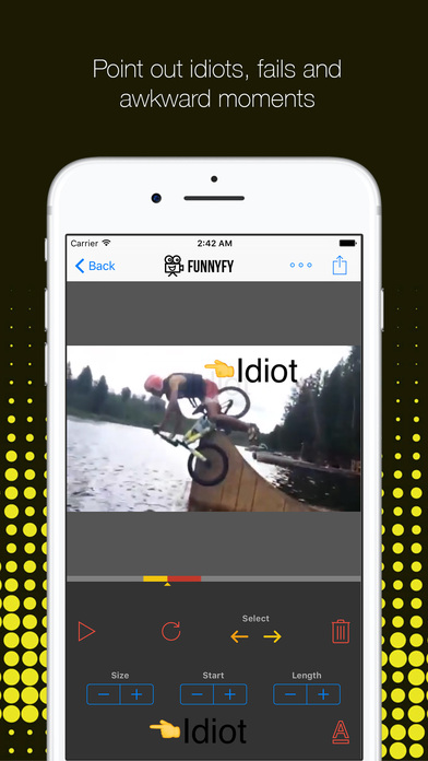 Un éditeur de vidéos ultra simple pour donner un effet humoristique à vos vidéos (fonction re-play, emojis, texte etc..). Nécessite iOS 9.0 ou une version ultérieure. Sans achats in-app.