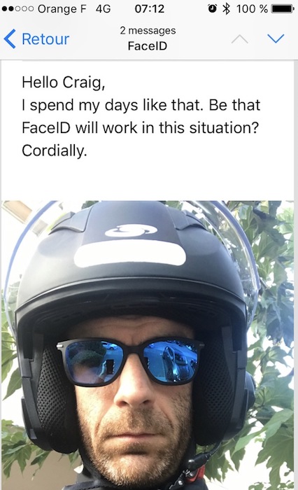 « Salut Craig, je passe mes journées comme ça. Est-ce que Face ID fonctionnera dans cette situation ? » L’utilisateur en question porte son casque et ses lunettes de soleil. Et il semble être inquiété par le fonctionnement de Face ID étant équipés de son casque et de ses lunettes. Craig confirme que :