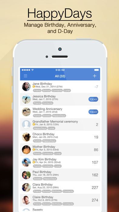 Vous avez une grande famille ? De nombreux amis ? Avez-vous déjà oublié un anniversaire ? HappyDays vous les rappellera ! Nécessite iOS 7.0 ou une version ultérieure. Compatible avec l’iPhone, l’iPad et l’iPod touch. Sans achats in-app.