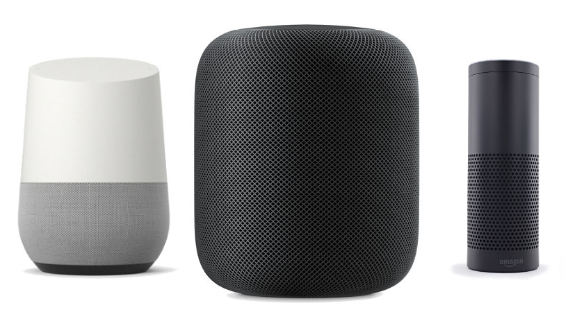 L’image ci-dessus montre le Google Home de Google, à gauche. Le HomePod d’Apple au milieu. Et l’Amazon Echo de Amazon à droite.