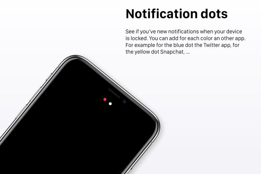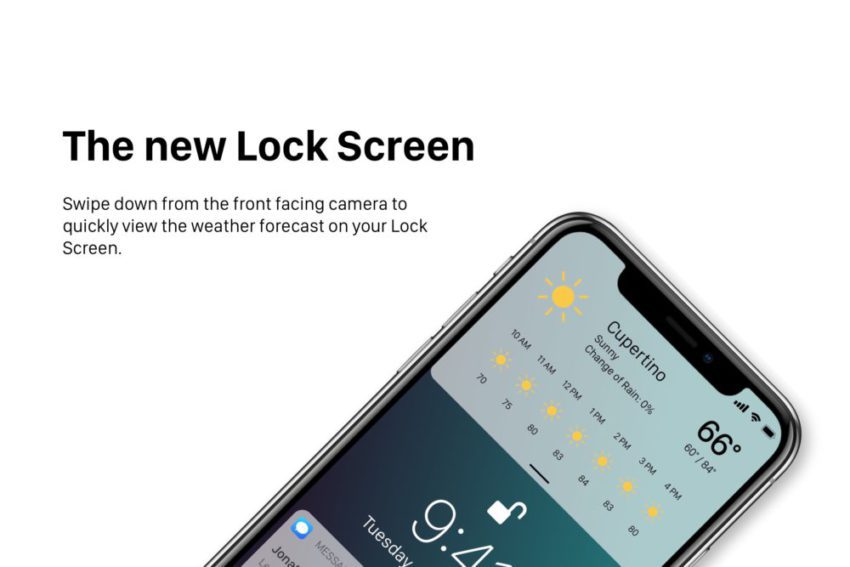 Avec ce concept, les applications sur l’écran d’accueil voient leur nom disparaître pour céder la place uniquement à l’icône de l’application. Question d’épuration de l’écran d’accueil. Un accès à la météo est possible simplement en glissant vers le bas depuis l’encoche de l’iPhone X.
