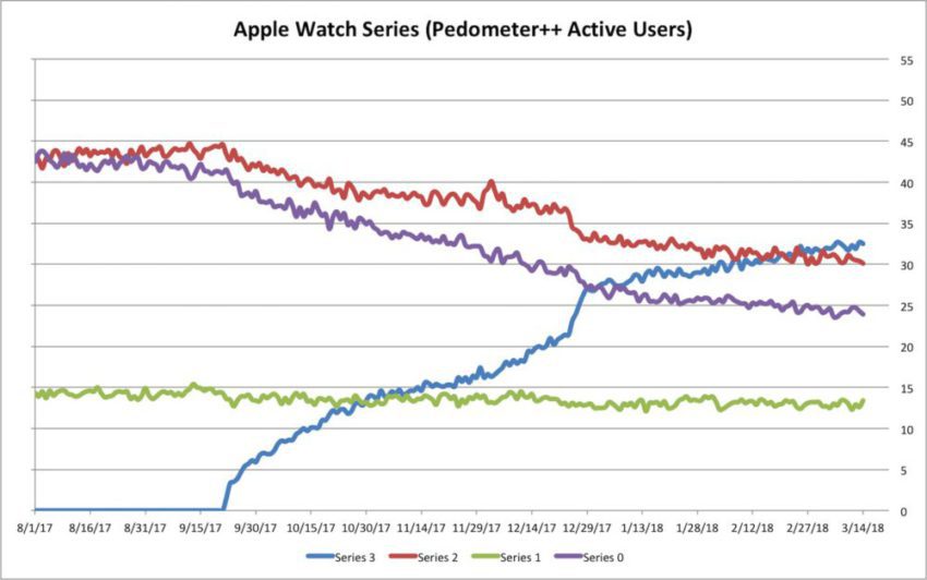 Conformément aux données de l’application Pedometer++ développée par Adam Smith, le taux d’adoption de l’Apple Watch Series 3 atteint les 33%, contre 24% pour l’Apple Watch Series 0, 14% pour l’Apple Watch Series 1 et 30% pour l’Apple Watch Series 2.
