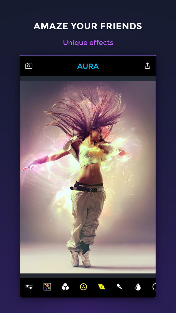 Aura met à disposition des outils puissants qui vous permettront d’ajouter des cadres, filtres, textes et bien plus encore à vos photos, de manière créative et ludique.