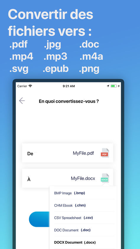Convertissez vos fichiers dans presque n’importe quel format majeur ! Cette appli peut convertir vos documents, vidéos, fichiers audio, livres numériques, images, feuilles de calcul, présentations, vecteurs, et plus encore !