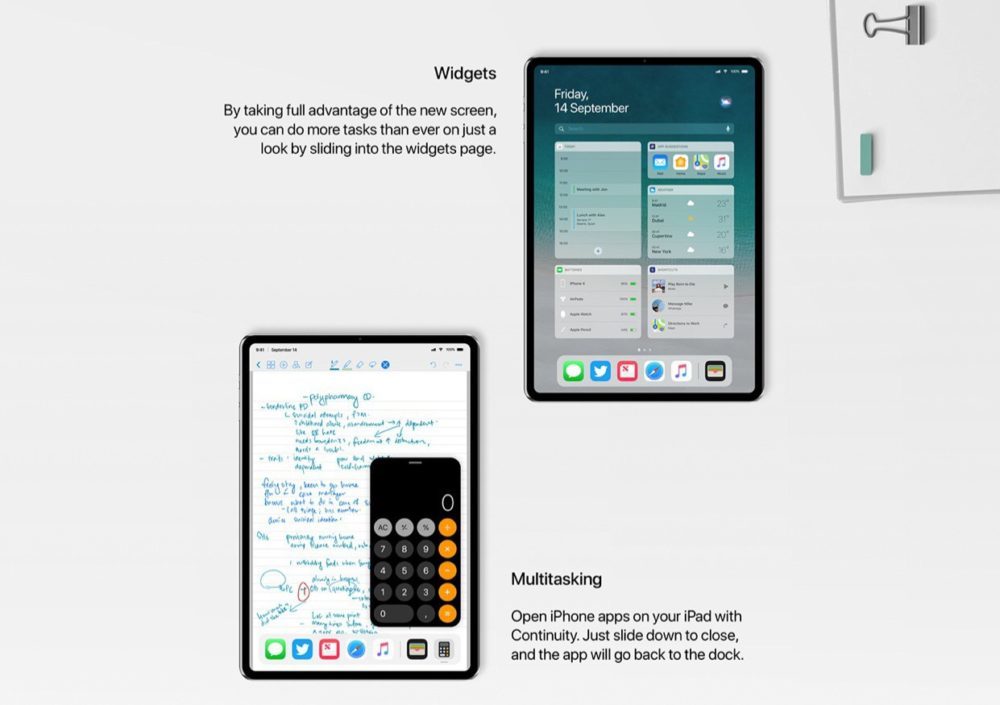 Ce concept nous laisse voir un iPad avec une dalle bord à bord, Face ID qui peut enregistrer jusqu’à 4 visages, une double caméra de 12MP au dos qui embarque le mode Portrait et un tout nouveau multitâche qui offre la possibilité d’ouvrir sur l’iPad les applications déjà ouvertes sur l’iPhone, grâce à la fonctionnalité Continuity qui est disponible sur masOS 10.14 Mojave, actuellement en version bêta.