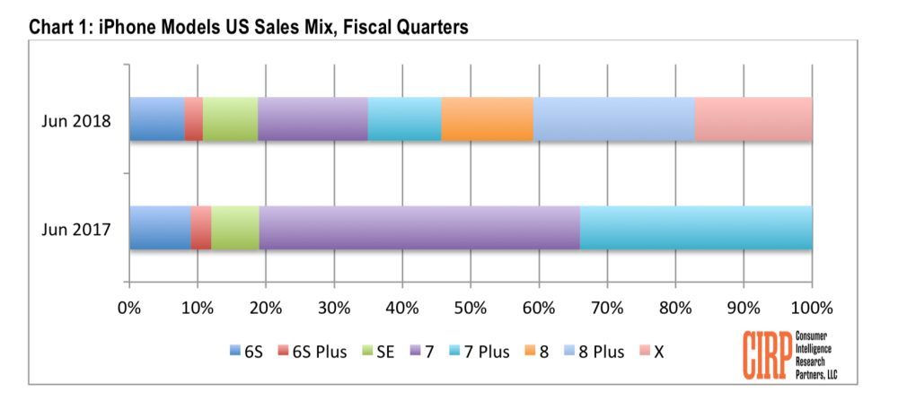 Selon les données du CIRP, l’iPhone 8 Plus représentait 24% des ventes d’iPhone pour le Q2 2018. L‘iPhone X représentait 17% et l’iPhone 8, 13% des ventes. Les iPhone de 2017 (l’iPhone 8, l’iPhone 8 Plus, l’iPhone X) représentaient 54% des ventes d’iPhone et les 46% restants étaient occupés par les anciens modèles d’iPhone (iPhone 7, iPhone 7 Plus, iPhone SE, iPhone 6s, iPhone 6s Plus).