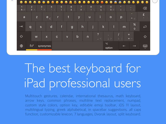Clavier pour les utilisateurs professionnels d’iPad, avec des gestes pour une saisie plus rapide, une mise en page PC, un clavier mathématique et de nombreuses autres fonctionnalités professionnelles.