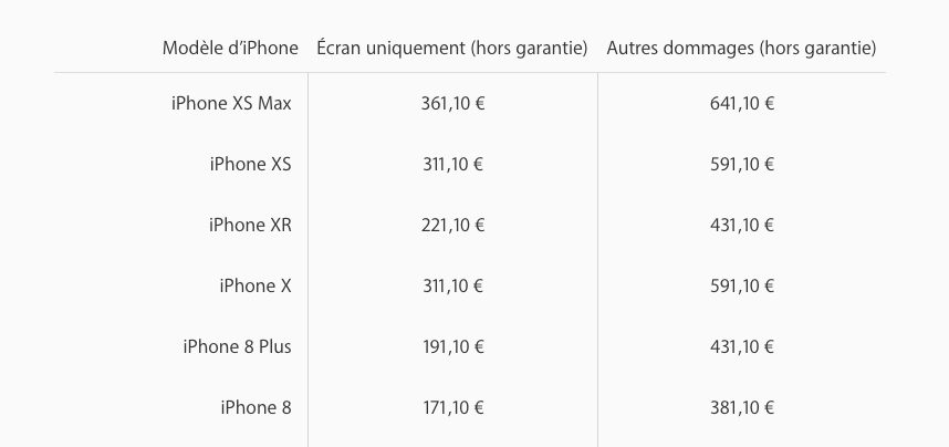 Si l’écran de l’iPhone XR hors garantie est brisé, le coût de réparation sera de 221,10 euros. Si l’iPhone XR a subi un autre dommage, les frais seront de 431,10 euros. Ces coûts de réparation sont moins élevés que ceux de l’iPhone X (311,10 euros pour l’écran et 591,10 euros pour les autres dommages), d’un iPhone XS (les frais similaires à l’iPhone X) ou d’un iPhone XS Max (361,10 euros pour les dégâts de l’écran et 641,10 euros pour les autres endommagements).