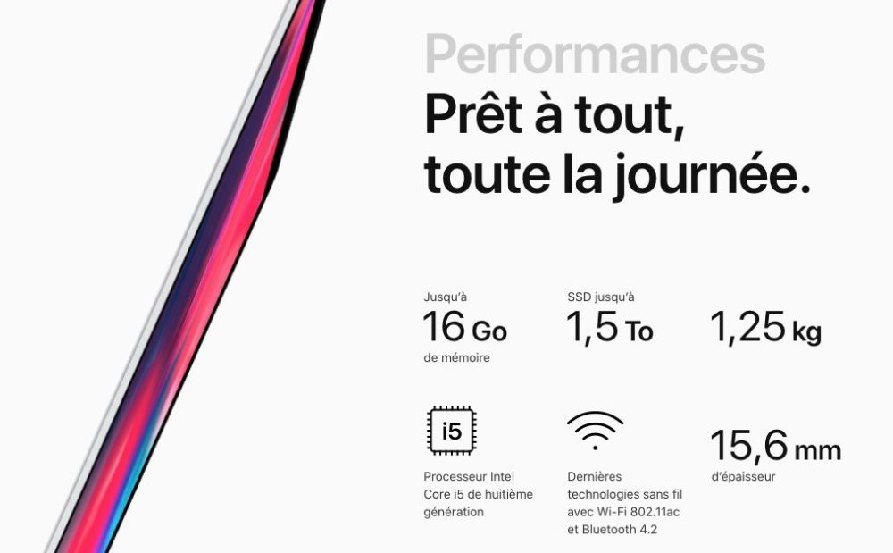 Le MacBook Air 2018 est plus puissant que son prédécesseur ; avec son processeur Intel Core i5 de huitième génération (jusqu’à 16 Go de RAM et jusqu’à 1.5 TB SSD), la machine peut facilement faire tourner plusieurs applications en même temps. Et un plus ; la batterie de la machine est beaucoup plus autonome : jusqu’à 13 heures de vidéos sur iTunes.
