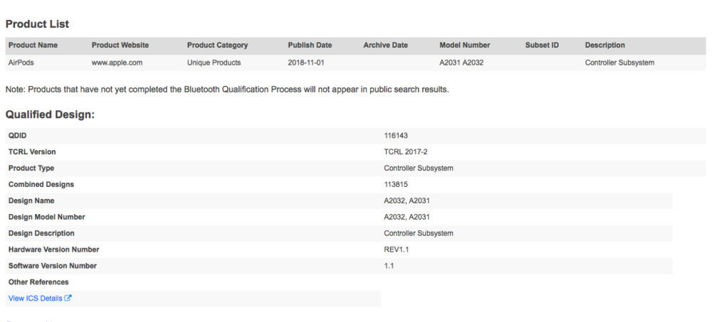 Dans la base de données du Bluetooth Special Interest Group, la firme qui supervise l’élaboration de la norme Bluetooth, des codes ayant rapport à de nouveaux AirPods ont été découverts. Ces codes ont pour numéros A2031 et A2032 et ont été mis en ligne le 1er novembre 2018. Ils représentent des appareils Bluetooth qui n’ont pas encore été enregistrés par Apple.