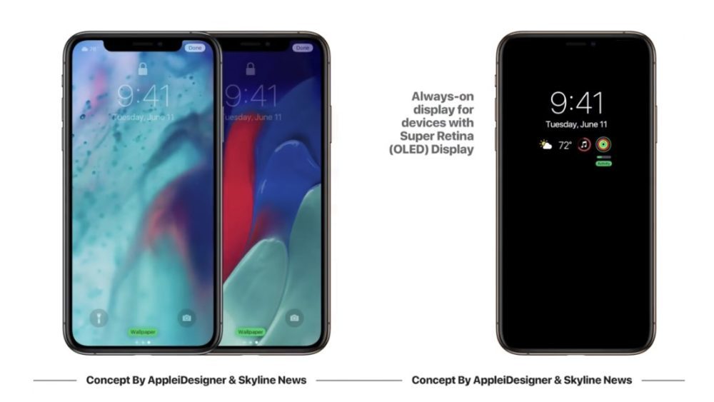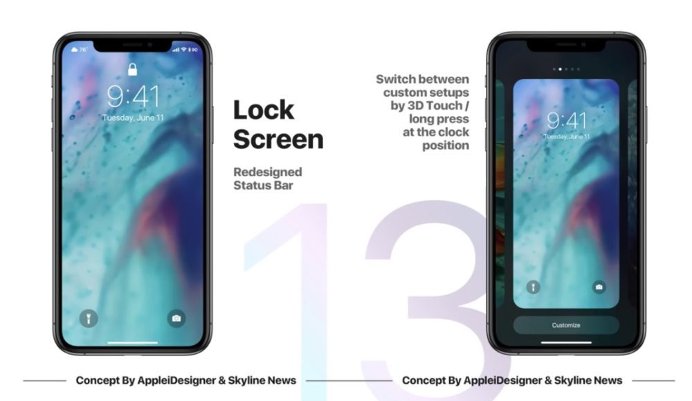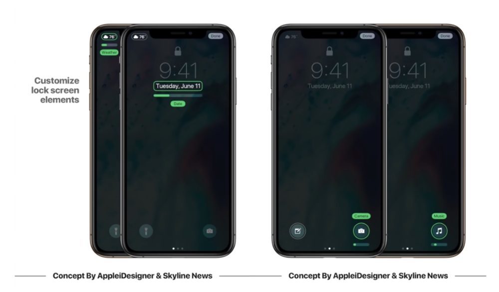 Le concept montre un écran de verrouillage avec une barre de statut redessiné ; montrant la météo dans le coin supérieur gauche et le réseau, le Wi-Fi, la batterie et son pourcentage dans le coin supérieur droit. Avec la possibilité de choisir à volonté entre plusieurs écran de verrouillage et de modifier les éléments sur l’écran.