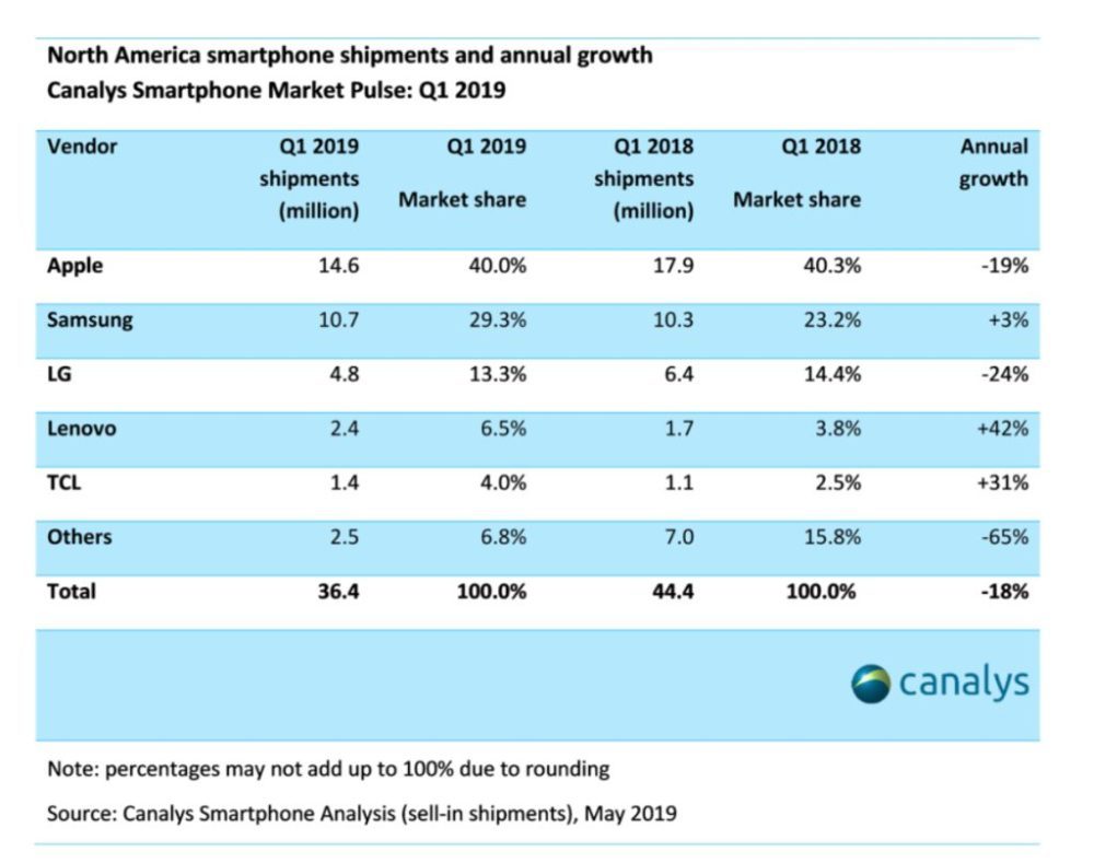Un nouveau rapport du cabinet Canalys est apparu. Ce dernier se penche sur le marché des smartphones en Amérique du Nord au premier trimestre de 2019. Et Apple peut se frotter les mains, (mais, à moitié).