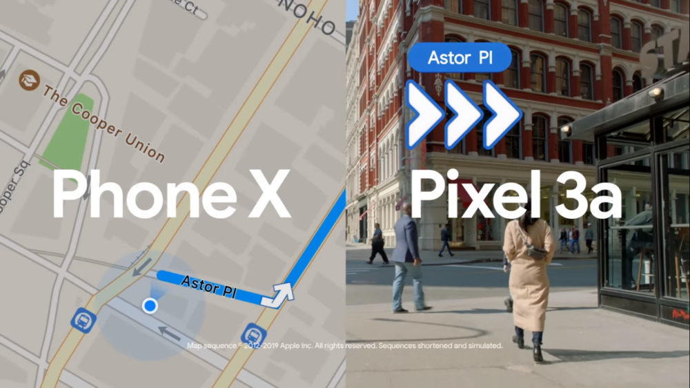 Google continuer de tacler Apple ; après la vidéo mettant en face la caméra du Pixel 3a et celle de l’iPhone XS, voici maintenant une autre qui compare Google Maps et Plans d’Apple. Dans la vidéo, Google met en avant la réalité augmentée dans Google Maps et montre comment l’application peut nous guider en temps réel simplement en dirigeant le smartphone (le Pixel 3a) et en suivant les flèches qui indiquent la direction. En description de la vidéo, nous pouvons lire : « Avec le Pixel 3a à 399 $, vous pouvez enfin arrêter de suivre le point bleu. Avec la réalité augmentée dans Google Maps, vous saurez où vous êtes et où aller ».