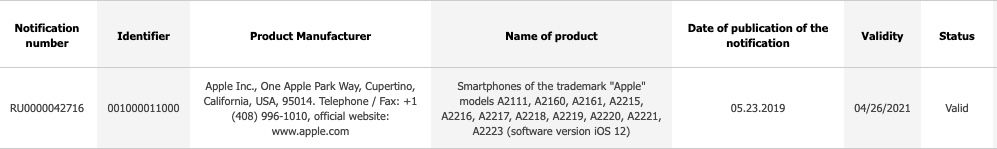 De nouvelles données qui font référence aux iPhone de 2019 viennent d’être divulguées par l’ECC (Eurasian Economic Commission), l’organisme de contrôle qui autorise la commercialisation des appareils électroniques en Russie, Biélorussie et dans quelques autres pays de l’Est de l’Europe. 11 nouvelles références ont fait leur apparition : A2111, A2160, A2161, A2215, A2216, A2217, A2218, A2219, A2220, A2221 et A2223. Il ne faut toutefois pas penser qu’Apple va présenter 11 iPhone ; mais il faut plutôt comprendre que les modèles d’iPhone varient selon les régions du monde et un même iPhone peut avoir plusieurs modèles.