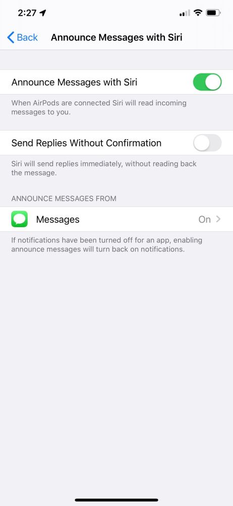 - On retrouve une nouvelle option « Envoyer des réponses sans confirmation » qui permet de répondre aux messages avec Siri quand on porte les AirPods
