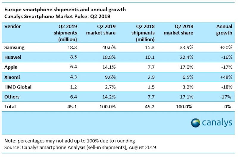 Un total de 45,1 millions de smartphones ont été vendus en Europe au Q2 2019, contre 45,2 millions il y a un an. Selon les informations fournies par Canalys, les 5 smartphones les plus vendus sont : le Galaxy A50 (avec 3,2 millions d’exemplaires), le Samsung Galaxy A40 (2,2 millions d’unités), le Xiaomi Redmi Note 7 (2 millions), le Samsung Galaxy A20e (1,9 million) et l’iPhone XR (avec 1,8 million).