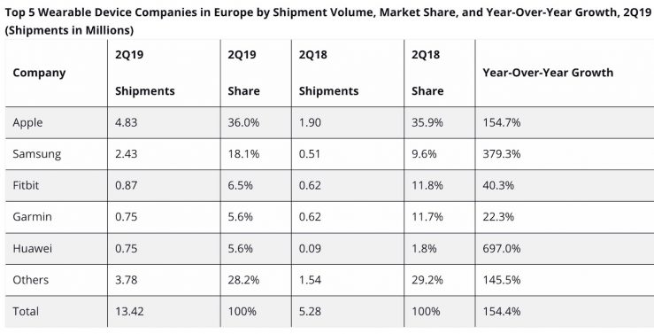 Apple a été le premier vendeur de wearables en Europe pour le deuxième trimestre de 2019. Le constructeur a réussi à écouler 4,83 millions d’exemplaires, en comparaison avec 1,90 million d’unités à la même période il y a un an, soit une progression de 154,7%. Malgré cela, la part de marché d’Apple n’a pratiquement pas bougé : elle est passée de 35,9% à 36%.