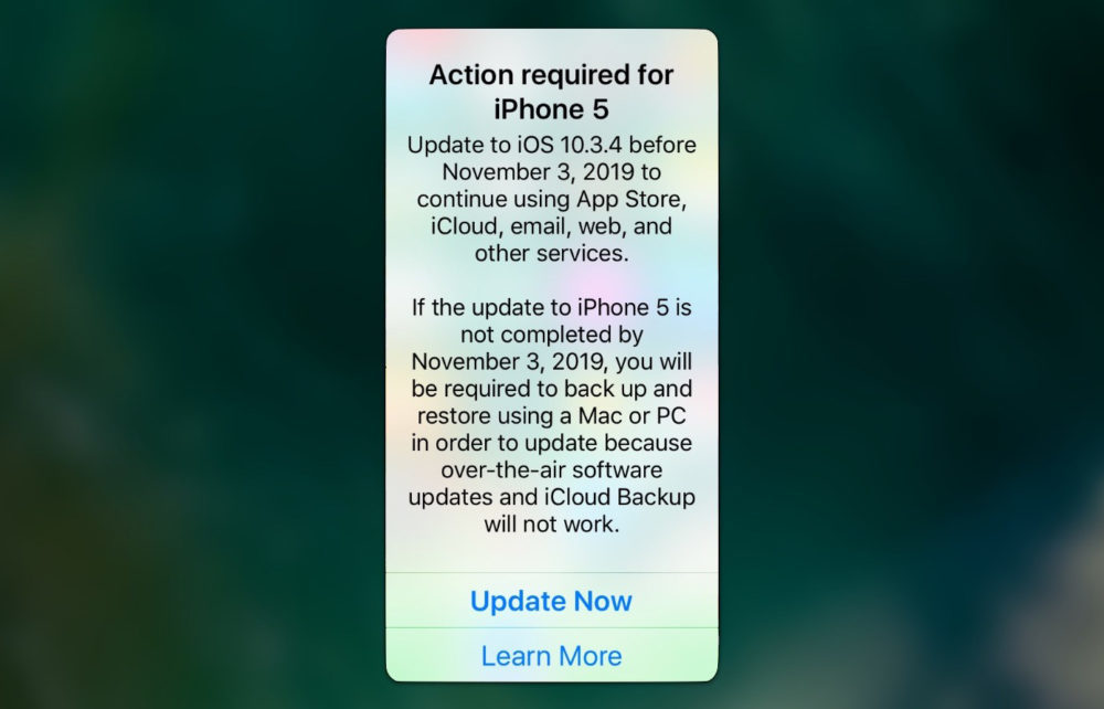 Vous utilisez un iPhone 5 ? Si oui, vous êtes invité à le mettre à jour vers iOS 10.3.4 avant le 3 novembre si vous ne souhaitez pas qu’il soit dysfonctionnel après cette date.
