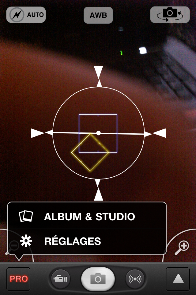 Voilà à quoi ressemble l’interface de la prise de vue. On reconnaît le bouton flash, la caméra frontale et les options de zoom. Mais d’autres options plus professionnelles vous sont proposées: choisir votre balance des blancs (à l’aide du bouton AWB), ou encore avoir un viseur plus poussé, agrémenté de deux carrés: le bleu vous sert à choisir le focus, tandis que le jaune permet de choisir un autre endroit pour l’exposition.